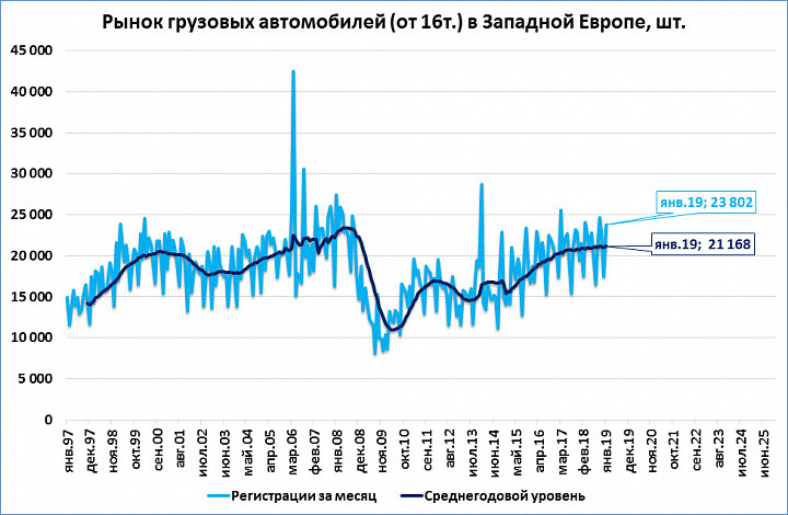 По данным АСЕА, в январе регистрации тяжелых грузовиков в Западной Европе достигли 23 802 шт. Это на 10,5% больше, чем в январе прошлого года: Удивительным образом, рынок и не падает, и не растёт уже долгое время: среднегодовой рост по итогам января +1,3%.