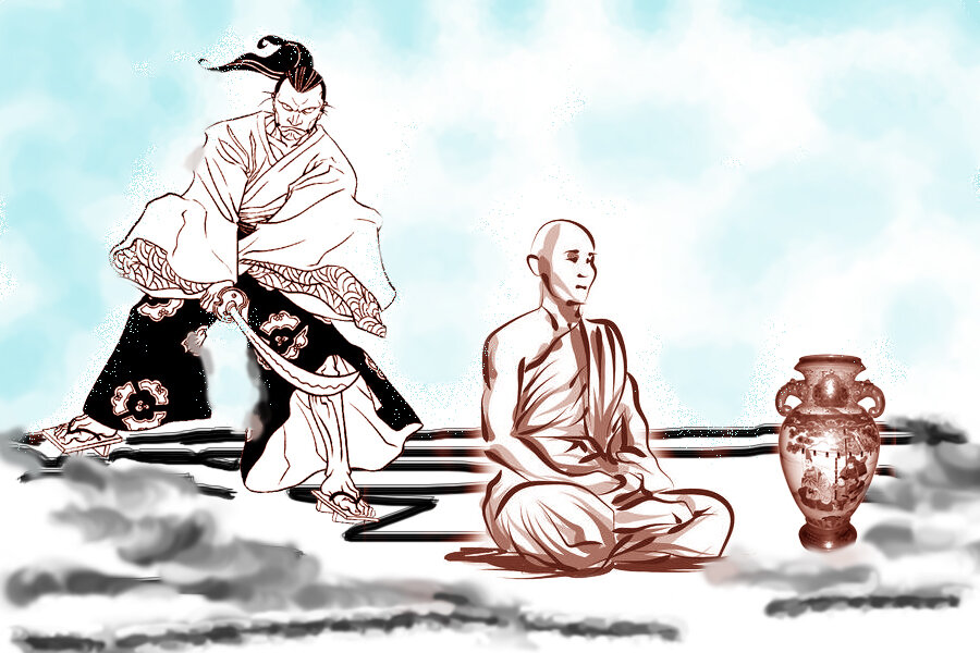 Жил-был однажды старый мастер Дзен. Он жил недалеко от деревни, в маленькой хижине у подножия горы. Однажды ночью, когда мастер, как обычно, сидел в своей хижине и медитировал, к нему ворвался грабитель. Угрожая мастеру дзен саблей, он потребовал у него деньги. - Возьми, - спокойно сказал мастер. - Все деньги лежат вон в той чаше на полочке. Только будь так добр, оставь мне пять монет - мне нужно на следующей неделе уплатить налоги. Грабитель выгреб из чаши деньги, а потом отсчитал и кинул обратно в чашу пять монет. Рядом с чашей на полке стояла изящная ваза. Она понравилась грабителю, и он тоже прихватил её с собой. Когда он собирался сунуть вазу в мешок, мастер дзен сказал: - Осторожнее с вазой, она хрупкая и может легко разбиться. Грабитель кивнул и повернулся было уйти, но мастер сказал: - Ты забыл сказать "спасибо". - Спасибо, - сказал грабитель и ушел. На следующий день в хижину мастер пришли жители соседней деревни. Все они были взбудоражены, поскольку той ночью гр