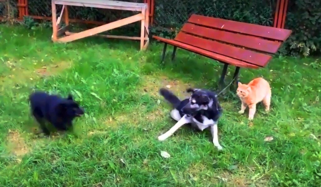 Коты по свое природе довольно своенравные и высокомерные животные. Заставить их что-то сделать совершенно не просто. Я бы даже сказал, невозможно. Особенно если это не в их интересах. Понятное дело, что собаке они уж тем более помогать не станут. Ведь это самый заклятый их враг. Но иногда случаются исключения в жизни. Например как у этой парочки. Очевидно что рыжий кот проживает вместе с собакой. И вот на прогулке их идиллию нарушает какой-то неугомонный пес. Я бы сказал что этот собакен с моторчиком. Он не перестает кружить рядом с привязанным псом (тот который сожитель кота). Судя по тому как они виляют хвостиками, собакам этот процесс нравится. Но только не котейке, которого этот неожиданный персонаж стал, как это модно говорить, вымыкать. Дошло до того-что котику пришлось поднять свой мягкий и пушистый задик и решить этот вопрос более жестким методом. В общем внизу есть видео, сами смотрите как дальше обстояло дело.