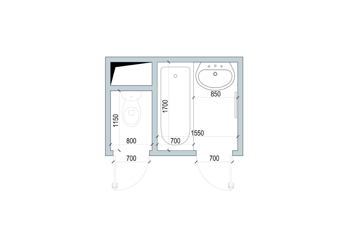 Дизайнеры часто пишут статьи и обзоры по данной теме, за что получают массу негативных комментариев и вопросов. И неудивительно, глядя на красивые картинки сложно представить, что подобные решения можно разместить на небольшой площади. В основе любого функционального решения лежит продуманная планировка под конкретные задачи, при этом учитывается и дальнейшая возможностью согласования. Можно и вовсе отказаться от половины кухни во благо санузла, но согласовать такое решение будет сложно. Если в квартире уже есть санузел и вы ищите способы его обустроить, то подобный материал вряд ли будет полезен. Дизайнеры в основном предлагают решения с нуля. На примере типовой планировки рассмотрим несколько возможных перепланировок. 1. Раздельный санузел. Вариант 1 ✔ Когда количество проживающих больше трёх, то санузел лучше оставить раздельным. ✔ Если позволяют габариты, можно разместить небольшой умывальник в туалете, чтобы избежать очереди в часы пик. ✔ Гигиенический душ удобен не только