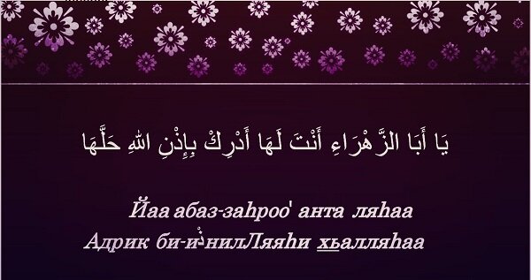 Сильное дуа для решения проблем ➊ Дуа — يَا أَبَا الزَّهْرَاءِ أَنْتَ لَهَا أَدْرِكْ بِإِذْنِ اللهِ حَلَّهَا Йаа абаз-заhроо’ анта ляhаа адрик би-иذْнилЛяяhи хьалляhаа Примечание: Хь — ح , Зь — ذ , О’- приостановка нажмите чтобы прослушать ➋ Дуа — اللَّهُ اللَّهُ رَبِّي لاَ أُشْرِكُ بِهِ شَيْئاً Аллааhу Аллааhу Роббии ляя ушрику биhии шай-аа -Подробнее об этом Дуa [ здесь ] Если человек попал в трудную ситуацию и не может найти выход из неё, как например застрял в лифте или остался без денег в каком-то месте и хочет добраться домой, то пусть повторяет первое Дуа — 11 раз, а второе Дуа — 2 раза, и всё это с надеждой и сильным упованием на Аллаhа и тогда Аллаh даст ему выход из этой ситуации ИнщаАллаh. Также второе Дуа читается тогда, когда есть нерешенный вопрос, особая нужда в решении конкретного дела и перед тем как узнать о результате этого дела, положительным он является или отрицательным, например ответ на то, сдал ты экзамен или нет, получил ли ты разрешение на что-либо или нет