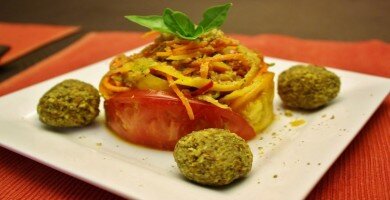 Состав продукта Лапша 1 морковь 1 красный перец 1 цуккини Шарики Гайки 1/4 чашки сырого миндаля 1/4 чашки сырых грецких орехов Тмин, кориандр, куркума, кайенский перец и др. и другие специи 2 зубчика чеснока Оливковое масло (или вода) Щепотка гималайской розовой кристаллической соли и перца Соус 1 помидор Базилик, орегано, другие специи 2 столовые ложки вяленых помидоров Щепотка гималайской розовой кристаллической соли и перца 1 зубчик чеснока Cheeze 1/3 стакана пищевых дрожжей 1 чайной ложки гималайской розовой кристаллической соли и перца, больше по вкусу 1 стакан грецких орехов (вымачивают и обезвоживают, если это возможно) Порошок карри - опционный Инструкции Лапша Нарезать все овощи очень тонко на мандолине, вручную или с помощью spiralizer. Посыпать небольшим количеством оливкового масла и соли и отставить в сторону. Шарики Гайки Импульсный миндаль, грецкие орехи и чеснок в кухонном комбайне, пока они не будут в очень грубом размере муки. Добавить специи и соль. Добавьте оливково