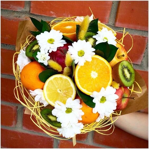 Сегодня в качестве подарка часто можно увидеть оригинальные букеты не только из цветов, но и из сладостей, фруктов, колбасно-сырных и рыбных изделий с напитками. Это уже вошло в тренд дарить невероятно красивые, стильные и вкусные букеты. В этой подборке я покажу немного вариантов, как можно оформить букет из фруктов и сладостей. Модные красивые и съедобные фруктовые букеты + фото