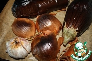 Ингредиенты для «Рийет из овощей и копченой курицы»: Рецепт «Рийет из овощей и копченой курицы»: Баклажаны наколоть ножом. Лук разрезать пополам.