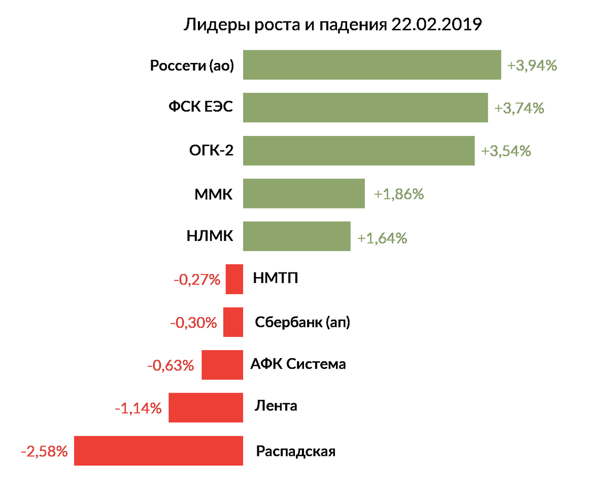 Лидерами роста стали Россети ао (+3,94%), ФСК ЕЭС (+3,74%) после сообщения о роста чистой прибыли по РСБУ за 2018 г., ОГК-2 (+3,54%), ММК (+1,86%), НЛМК (+1,64%).