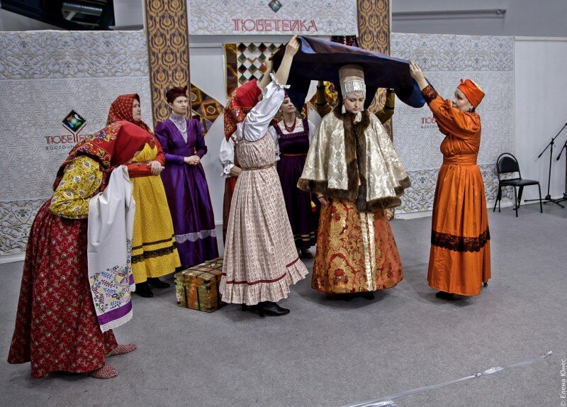 (Федор Сологуб ) Свадебный ритуал – одно из самых значимых событий в жизни – не обойден ни обрядами, ни приметами. Мелочей в нем быть не может. Одежда, угощение, слова и действия участников – все имеет традиционные объяснения, к которым мы с интересом прислушиваемся, даже если не выполняем. Коллектив студии «Русские начала», ранее "Православный учебный центр" (1999 - 2009), на протяжении 20 лет занимается изучением и возрождением русского традиционного костюма. «Русские начала» – общественная любительская организация, объединяющая мастеров народного костюма. На выставке "Тюбетейка" участницы клуба показали обряд - "Одевания невесты" из цикла "Традиции русской свадьбы". Сборы невесты к венцу - обряд старинный и интересный. Невесту вели под руки потому как перед этим ее одевали и накрывали фатой, то есть платком, который скрывал ее лицо и голову. Так делали потому, что девушка, по древним религиозным представлениям, находилась между мирами: она уже не была девицей, но еще не стала ж