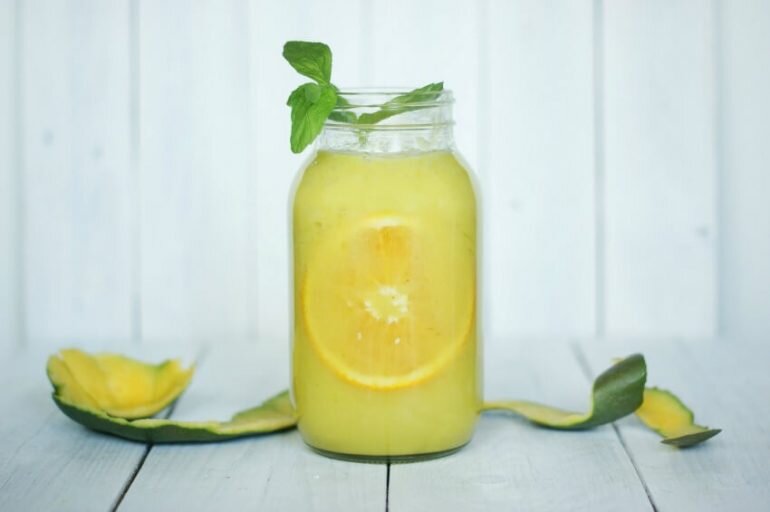 Я смотрю на свой «солнечный смузи», и слова разных классных песен сразу же всплывают в моей голове, и на моем лице появляется улыбка. Даже хочется танцевать ;). Коктейль ассоциируют с солнцем, беззаботным и летним. Лето, безусловно, мое любимое время года, и я была бы счастлив жить где-нибудь в тропиках. :). Что я могу сказать об этом коктейле? Это будет вкусно, сладко и освежающе , все благодаря великолепному сочетанию банана, сладкого манго, сочного апельсина и ароматной мяты. В жаркие дни добавьте в него несколько кубиков льда или замороженного банана и наслаждайтесь его восхитительным вкусом на солнце. Желательно в саду или где-нибудь на траве;). ИНГРЕДИЕНТЫ ПОДГОТОВКА Выжмете апельсиновый сок. Вы можете сделать это с помощью простой ручной соковыжималки для цитрусовых или просто сильно сжать апельсиновые половинки (как лимон). Чтобы получить больше сока из фруктов, можете потереть его, перекатывать на кухонном столе. Поместите все ингредиенты в блендер. Смешивание начните с вари