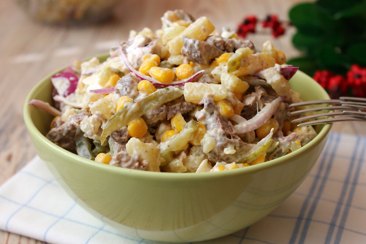 Сегодня готовлю очень вкусный, сытный салат с говядиной... Он такой — истино мужской, "брутальный", в нём много мяса, отварного картофеля, в общем, он очень-очень сытный. Ингредиенты: Варёная говядина — 350-400 г 3-4 отварные картофелины 3-4 соленых или маринованных огурца Небольшая головка салатного фиолетового лука, или обыкновенного репчатого Баночка консервированной кукурузы Майонез Чёрный молотый перец, соль... Вареную говядину, отварную картошку и соленые огурчики нарезаем одинаково — соломкой\брусочками. В этот салат вместо говядины можно использовать отварной язык, а еще очень вкусно с обжаренной печенью. Во всех этих вариантах, салат не потеряет сытность... И, мясо лучше нарезать покрупнее. Складываем все нарезанные продукты в миску, добавляем лук, нарезанный полукольцами и консервированную кукурузу. Заправляем салат майонезом, добавляем зелень при желании, перчим, солим. Перемешиваем и подаем к столу. Приятного аппетита! Если Вам понравился рецепт, поставьте лайк, и не забудь