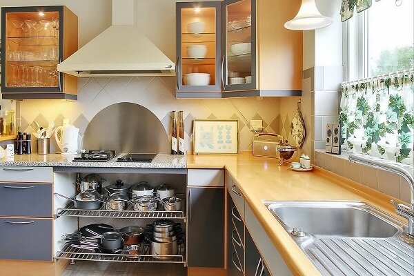 Также на кухне необходимо организовать место, где будет храниться посуда, необходимая для приготовления пищи. Для кухни лучше всего заказать мебель по индивидуальному заказу.