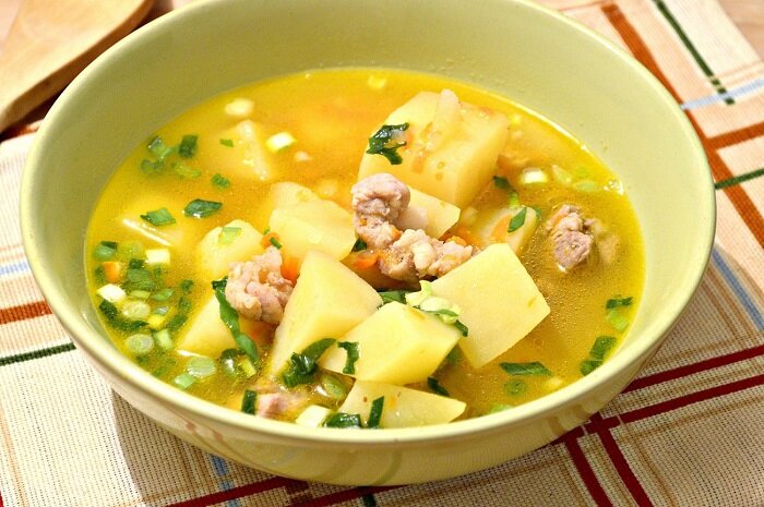 Суп из свинины - это блюдо, которое сделает сытым и добрым любого мужчину. Его нельзя назвать лёгким, но в холодное время года, когда организму нужна более калорийная пища, рецепт супа из свинины будет особенно актуален. Картофельный суп со свининой Хотим рекомендовать отличный рецепт картофельного супчика со свининой. Суп получается очень вкусным, сочным, довольно сытным и душистым. Для бульона предпочтительнее применять свинину на косточках. Пробуйте, суп вам и вашим близким обязательно понравится! Ингредиенты: Приготовление Свинину уместить в кастрюлю, залить жидкостью, довести до закипания, убрать пену. Бульончик посолить и варить мясо на маленьком огне до полной готовности (минут сорок-сорок пять). Далее мясо достать из бульона, долить водичку в кастрюлю, довести до закипания. Мясо остудить и очистить от костей. Большие части мякоти порезать. Морковь, картошечку, лук и чеснок почистить. В бульон добавить покрошенный небольшими кусочками картофель, готовить его 25 минут (до полн