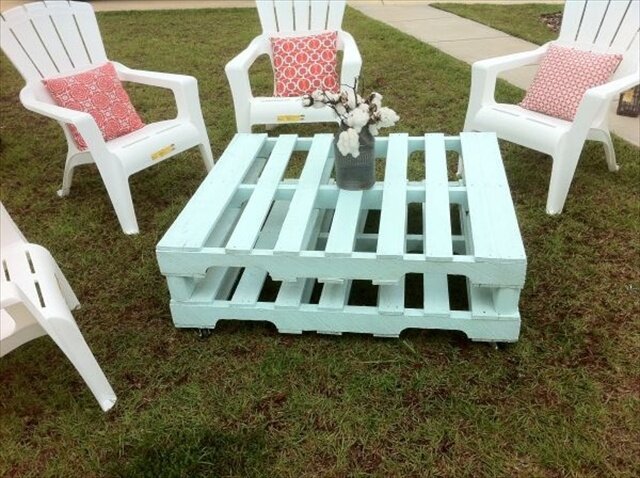 Если вам нужен журнальный столик, соедините две паллеты «ножками» друг к другу, закрепите по углам длинными шурупами, покройте лаком или слоем краски. Прикрутите к нижней паллете ножки на колечиках. При желании, можно в качестве столешницы положить закаленное стекло. Столик получится функциональным: его легко передвинуть, благодаря колесикам, а нижняя палета будет выступать в качестве полки.Фото: Журнальный столик