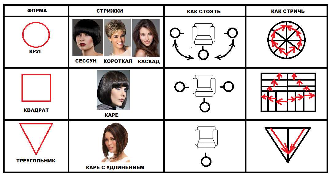 Приветствую Вас, мои верные читатели! Вот и 33 занятие из полугодичного курса осталось позади. Спешу по горячим следам поделиться с вами военными тайнами от майора Пэйн. Утро понедельника началось с того, что наша строгая наставница пребывала в хорошем настроении и сообщила, что сегодня будет раздавать секретные материалы направо и налево. Я как раз сидел слева и понял, что в этот раз мне подфартит. Сегодня мы рассматривали способы моделирования любой стрижки. Напомню, что базовых стрижек всего три: круг, треугольник и квадрат. Вот именно в этих формах и можно сваять любую стрижку. Для наглядности Пэйн вывела на доске секретный план (женщин она изобразила более схематично, но я внес коррективы): Давайте разбирать схему. Круг - это равномерномерное распределение волос по контуру. Наиболее популярные стрижки в форме круг – «сессун» и «каскад». Сама техника стрижки подразумевает постоянное хождение вокруг клиента и постоянную ловлю подвижной контрольной пряди. Стричь круг нужно обя
