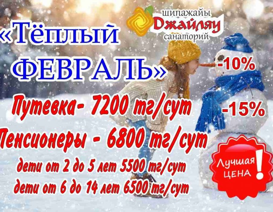 Путевка(от 3 дней пребывания!) со скидкой 10 % - 7 200 тг/сутки! Пенсионерам скидка 15 % - 6 800 тг/сут! В цену включено: проживание в номере класса полу-люкс, питание (полный пансион) + базовые оздоровительные процедуры! МЫ ЖДЕМ ВАШИХ ЗВОНКОВ! РАННЕЕ БРОНИРОВАНИЕ - РАЗУМНЫЙ ШАГ! УИКЕНД В ДЖАЙЛЯУ!