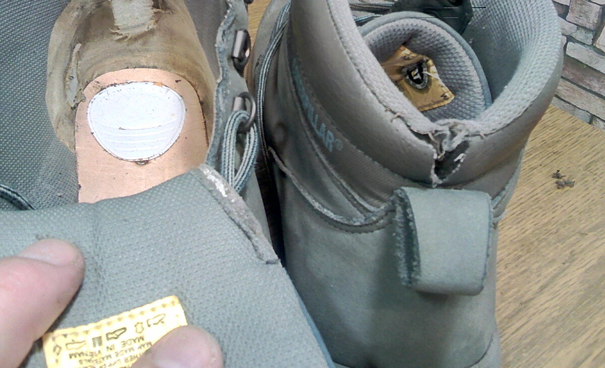 Доброго времени, дорогие читатели! Попались мне недавно ботинки одного известного бренда. Они собраны очень хорошо. Голубой нубук, всё хорошо прострочено, подогнано, проклеено. На том, что слева на фотографии, белая такая округлость на стельке - это не бутафория, это пружинящая вставка. Зачем, ради какой экономии следовало делать единственную деталь из кожзаменителя - для меня полная загадка. Ведь если взять менее ответственную деталь, например, тот же берец или язычок - площадь его была бы больше, а шансов повреждения - меньше. Ну да ладно, не наше дело, надо ремонтировать. Вначале была идея продлить до верха мягкий задник и собрать всё на него. Однако мягкий задник - деталь заменяемая, её в процессе эксплуатации этой пары скорее всего нужно будет менять опять. Плюс она должна исполняться из мягкой кожи, а здесь лучше перестраховаться. Поэтому сделаем латки из нормальной такой кожи, запустим достаточно далеко по краям и соберём на них. Излишне напоминать, что края латки сбрусованы.