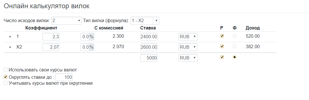 Что такое "вилка" - данное определение Вы легко найдете на просторах интернета, но я скажу своими словами) "Вилка" - это ситуация, как правило возникающая из-за ошибки БК контор, когда коэффициенты на исход противоположных событий, в разных букмекерских конторах приносят Вам прибыль. Рассмотрим какую-либо игру, для примера, скажем футбол. В одной букмекерской конторе, на победу команды один с учетом дополнительного времени, дают коэффициент 2,3 (т.е. П1 - 2,3). В другой букмекерской конторе на победу второй команды или ничью, с учетом дополнительного времени, дают коэффициент 2,07 (т.е. П2 - 2,07). Что мы имеем, если сделаем ставки на эти события, скажем с общим банком в 5000 рублей.