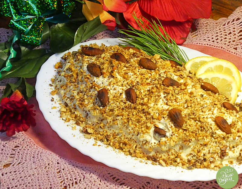 Очень необычное сочетание продуктов, однако интересное, оригинальное и вкусное! В России сельдь любит одеться в «шубу». Хотя и в других странах у него не менее привлекательный «гардероб». Это рецепт принца Еугена, герцога Нерского, младшего сына норвежского короля Оскара II. Ни яиц, ни картофеля в салате нет. Все очень сдержанно и элегантно, как и подобает королевским особам! Ингрендиенты: Заправка: Приготовление: Филе сельди очистить от костей и нарезать продолговато полосками. Разделить на две части. Выложить одну часть на селедочницу, формируя фигурку «рыбки». Миндаль поджарить на сухой сковороде, охладить и измельчить скалкой. Яблоки очистить от кожуры и семян и натереть на крупной терке. Смешать вместе с измельченными орехами. Сбрызнуть смесь лимонным соком и перемешать. Выложить "шубку" сверху на сельдь. Приготовить соус, смешав все компоненты. Смазать им салат. Все слои повторить в той же последовательности. Сверху снова смазать салат соусом. Украсить по желанию - молотыми и цел
