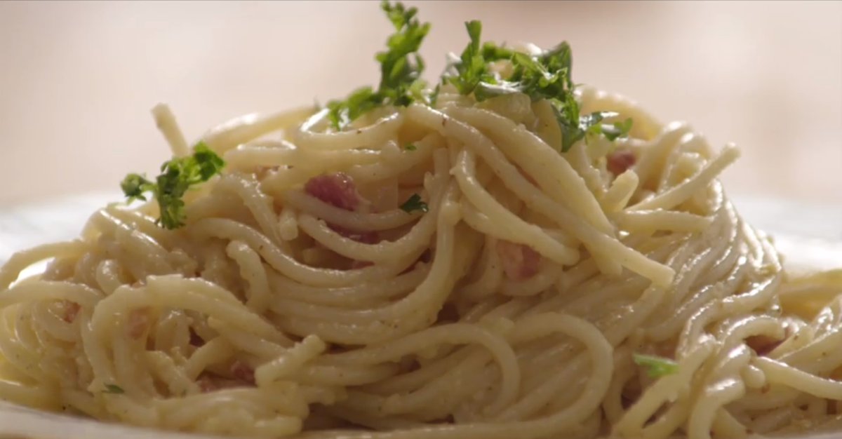 Очень вкусный рецепт. Его соус - классическая форма для приготовления пасты. Подлинный итальянский соус карбонара содержит желток куриного яйца, сыр и бекон. Есть много версий его приготовления. ИНГРЕДИЕНТЫ НА 4 ЧЕЛОВЕКА: 400 гр спагетти 2 яйца 150 гр сыра (натереть) 120 гр бекон соль и перец растительное масло 1. В большое количество кипятка положить горсть соли. Затем добавить спагетти и варить их около 10 минут, пока макароны не будут “аль денте”. Желательно их часто перемешивать, особенно в начале приготовления, чтобы они не прилипали. 2. Пока паста готовится, добавьте желтки в миску. Добавить тертый сыр и перемешать ингредиенты вилкой до получения очень плотной массы. 3. На сковороду, без масла и на сильном огне, положить нарезанный кубиками бекон. Примерно через две минуты, когда бекон будет обжарен, выньте его и отложите. 4. Когда спагетти будут готовы, откиньте их на дуршлаг, чтобы стекла лишняя вода. 5. Горячие спагетти добавить в смесь желтка и сыра, а затем добавить бекон и