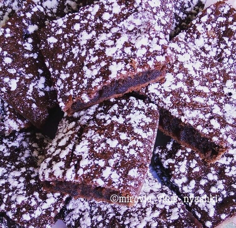 Подавать брауни можно с шариком мороженого или просто посыпав сахарной пудрой.
