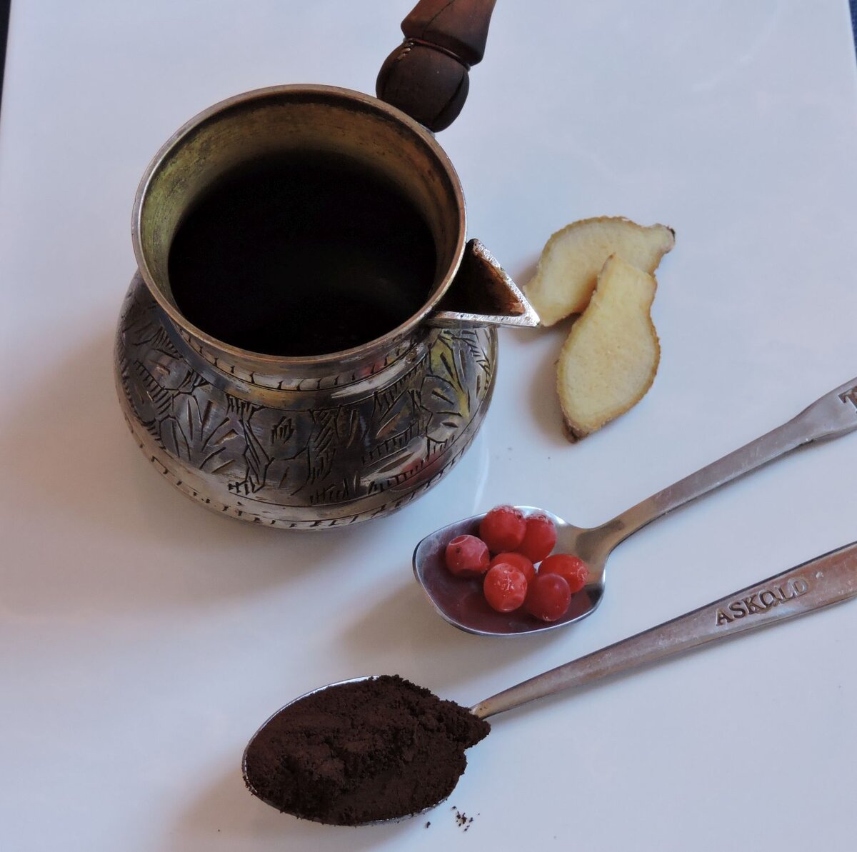 Кофе с имбирем я себе варю в штатном, так сказать, режиме. Ежедневно минимум одну, а то и две чашки, утром – это маст хев, ну, и в течении дня, бывает. Такой кофе отлично бодрит, да и вкус мне очень нравится. Но я люблю разнообразие, и эксперименты. Недавно в морозилке обнаружилась баночка замороженных еще с осени ягод калины. Посмотрел на них, подумал – почему бы не добавить в кофе, дополнительно к имбирю? Рецепта как такового не будет, все ингредиенты вы и так видите на фото (одна ложка кофе уже в турке), ну а процесс варки стандартный. Ягоды я не давил, вот как они есть, так и закинул в турку. Варю до появления кофейной пены, но так, что бы не вскипало. После чего 2-3 минуты даю настояться. Что получилось в итоге. Имбирный кофе с лёгкой приятной кислинкой, которую дает калина. Вся её горечь выморозилась, остался приятный аромат ягод, очень лёгкий. Думаю, следующий раз надо добавить больше ягод, раза в два, вот тогда, наверное, в самый раз будет. Впрочем, рябина в сахаре отличн
