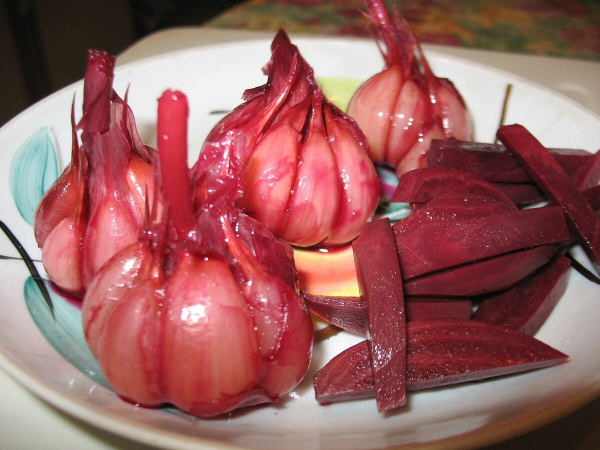 Самый вкусный маринованный чеснок! Всем большой привет. Хочу с вами поделиться рецептом маринованного чеснока, который делает моя мама уже несколько лет. В нашей семье он идёт на ура. Попробуйте и вы приготовить такой вкусный чесночок. Для его приготовления нам понадобится: 1) - конечно же сам чеснок - 1 кг. Для маринада: 1) уксус 9 процентный - 200 мл, 2) - вода - 200 мл, 3) - соль 40 грамм и сахара 70 грамм, 4) - одна свежая свекла, 5) - лавровый листик из расчёта один на одну баночку. Начинаем готовить. Для начала, кипятим чайник с водой. Ополаскиваем головки чеснока холодной водой. Свеклу нарезаем крупными брусочками. Теперь готовим сам маринад: Смешиваем в кастрюле уксус с одним стаканом кипятка, добавляем соль, сахар и провариваем его еще 5 минут. Берем пустую чистую баночку - кладем на дно один лавровый листик, кусочки свеклы и чеснок. Заливаем всё маринадом, закрываем плотно крышкой (хорошо подойдут баночки с крутящимися крышками) и оставляем на столе до полного остывания