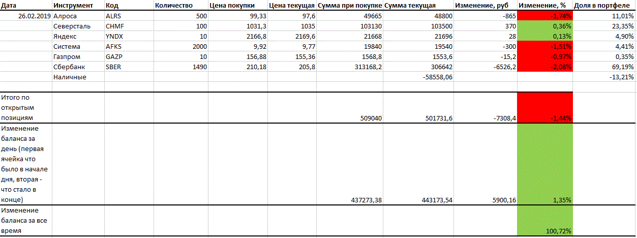 Сегодня рынок практически стоял на месте - индекс ММВБ, можно считать, не изменился - закрылся минус 0.02%. Тем не менее для меня день оказался очень удачным. Все позиции, кроме Сбера, выросли в разной степени. Особенно Алроса, Северсталь и ММК. Последнюю даже пришлось продать, так как была достигнута цель, ради которой покупался этот лот. На освободившуюся сумму (+10000 еще довложил наличными) прикупил немного Яндекса, считая, что потенциал для роста у него есть. В конце дня увеличение баланса составило 1.35%, а всего с начала торговли имеем +0.72%. Вот так на сейчас выглядит таблица результатов: Завтра опять, скорее всего, будет боковик. Если Северсталь еще подорожает на 1%, то продам и переложусь в другие бумаги. На хлеб сегодня заработали. Завтра будем зарабатывать на масло!