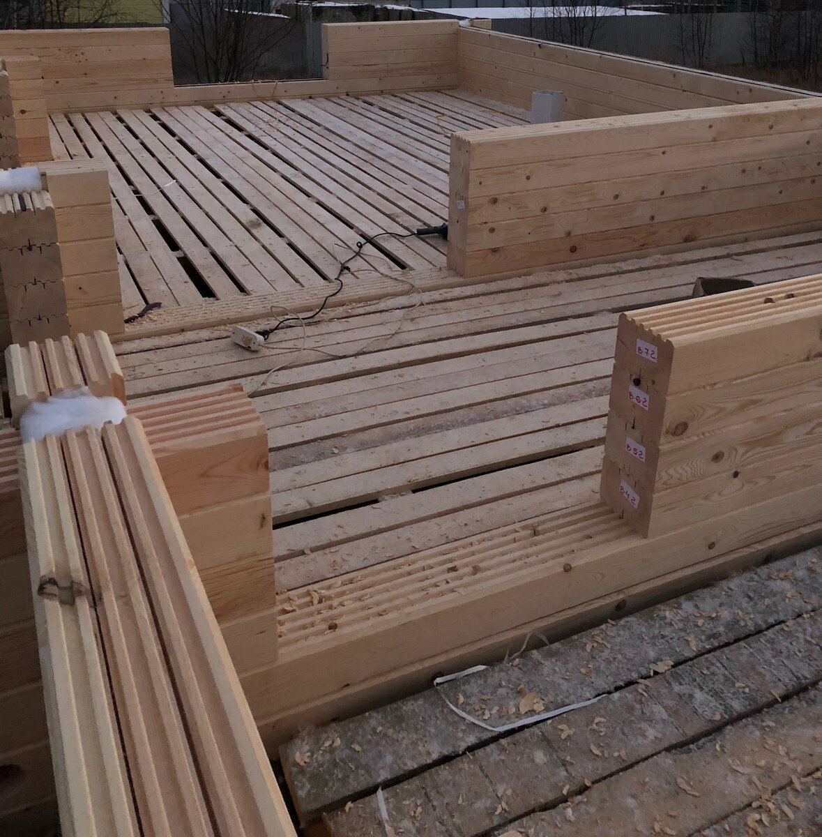 Очень доволен, что не поскупился на утеплении псулом (предварительно сжатой уплотнительной лентой), которая сама расширяется по необходимости при усадке дерева. Более актуально для бруса с профилем гребенка, где псул прокладывается по краям гребенки. Хотя и для оцилиндрованного бревна с финским профилем есть возможность для псул. Специально сделал фотографию с тепловизора, на которой видно, что между венцами холод не так сильно проходит. Но я сделаю еще фотографии в конце недели, когда будут морозы, разница будет заметнее, но интересно замерить температуру стены и соединения венцов.