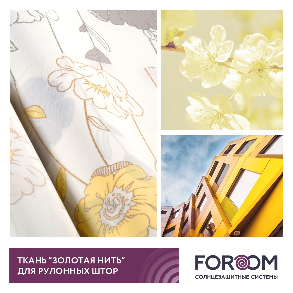 Рекомендуем обратить внимание на ткань «Золотая нить». Светлое полотно имеет крупный цветочный рисунок, по контурам которого нанесены мерцающие частицы - глиттер. Блестящие вкрапления добавляют материалу изысканности и богатства. Благодаря переливающимся конурам цветов на ткани «Золотая нить» особенно красиво смотрится на окне вечером при включенном в помещении свете. Заказать рулонные шторы тм FOROOM можно в любом нашем офисе продаж: https://okonman.com/адреса_салонов