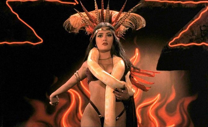Двадцать с лишним лет прошло с момента выхода фильма от “Заката до рассвета”. И хоть сам фильм не стал супер популярным и сборы его оказались весьма скромными, но эпизод с выходом и танец со змеей Сальмы Хайек, сделал фильм культовым и до сих пор будоражит умы миллионов поклонников. Сальма Хайек и в свои 50 выглядит потрясающе, ну а тогда в период своей молодости она была неотразима. Короткий эпизод с танцем оказался культовым моментом всего фильма и остается им до сих пор. Именно танец Сальмы позднее был признан одним из самых горячих эпизодов в кино. В общем в этой роли без единого монолога актриса в танце проявила свою горячую природу. Тарантино приметил Сальму еще в фильме «Отчаянный», где она сыграла в паре с Бандерасом. Изначально образ королевы тьмы был немного другой - по сценарию ее имя было Death Blond («Смертоносная блондинка»), но позже Тарантино увидел в этой роли только Хайек и даже сменил имя персонажа специально под нее. «Santanico Pandemonium» - это оригина