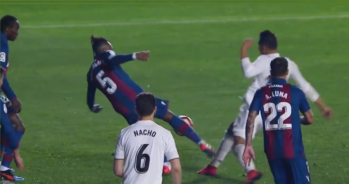 В воскресенье 22:45 по мск в Испании состоялся матч Ла лиги «Леванте» - «Реал Мадрид», в котором королевский клуб одержал победу над «лягушками» благодаря 2-м назначенным пенальти(итоговый счет: 1-2). На 75 минуте встречи и случился этот забавный момент. После подачи углового, игрок хозяев, вынося мяч из штрафной, «зацепил» хавбека «реала» Каземиро, который от «удара» сделал феерическое сальто. Судья без колебаний назначил пенальти. На первый взгляд кажется, что фол был и никаких претензий к арбитру быть не может. Но, посмотрев повтор момента, можно увидеть искусно исполненную «игру» хавбека «Реал Мадрид», которая заслуживает оваций за свою гениальность. Ведь даже «видеоповторы» не помогли судье переубедиться, что фола как такового не было; и игрок должен получить «горчичник» за симуляцию. Но этого не случилось; пенальти успешно реализовал Гарет Бэйл, что позволило «Реал Мадрид» победить в этом «поединке». Блистательная актерская игра опорного полузащитника