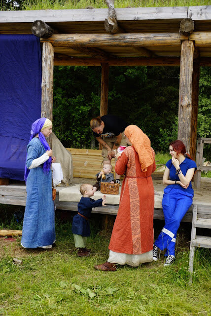Продолжу рассказ о рыцарском турнире Сразу при входе на площадку вы окунаетесь в атмосферу средневековья - вас окружают люди в одежде средневековой моды. Лотошники предлагают свой товар А на площадке уже много зрителей - идет пеший турнир рыцарей Но вот закончился звон мечей и перед конным состязанием объявлен перерыв А здесь встречают рыцаря после поединка. Для него уже готова ванна с благовониями Рядом работают кузнецы Хозяин трактирчика знакомит с технологией приготовления вкуснейшего эля, который тут же можно продегустировать Неподалеку - древняя печь для хлеба и жернова - можно самим помолоть зерно и выпечь ароматную экологически чистую бездрожжевую булку Для детей есть развлечения - карусель, Бои для зрителей Юные рыцари Недалеко от рыцарского ристалища - сцена, где трубадуры и министрели показывают свое искусство Прекрасная дама в образе средневековой крестьянки знакомит с инструментами А рядом уже готовят лошадей к кульминации - турниру на копьях