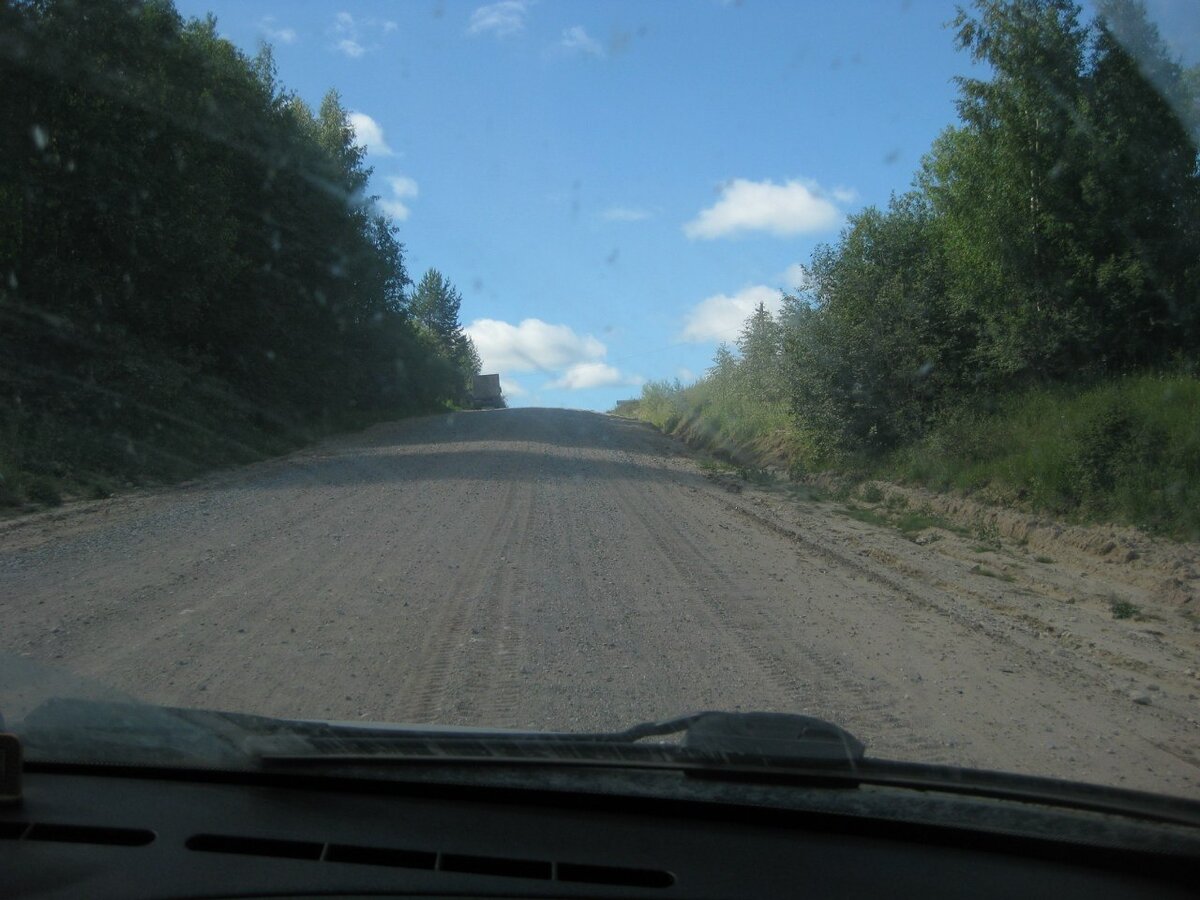 Перегон в 650км до Архангельска давался достаточно легко в скоростном режиме без долгих остановок. Трасса на Холмогоры (кстати, вроде как оттуда выдвинулся наш первый знаменитый ученый-автостопщик Ломоносов в свой путь) значительной частью представляла собой усыпанный щебнем грейдер. По которому мы, побеждая версту за верстой, оставляли за собой огромный серый каменно-пыльный шлейф.
