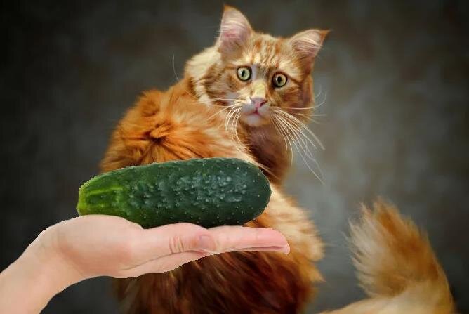 На просторах интернета можно найти огромное количество видеороликов, в которых кошки боятся огурцов. В этих домашних видео, хозяева пугают своих хвостатых питомцев зеленым овощем внезапно. Давайте подробно обсудим данную тему и разберемся в причинах данной реакции усатых. На каждом видео представители кошачьей породы бурно реагируют при виде огурца - отпрыгивают в сторону. Что же происходит на самом деле? Неужели для кошек так опасен данный овощ? – Нет, просто в привычной и спокойной для кошки обстановке, когда она кушает, незаметно для ее кругозора подкладывается огурец. И тут срабатывает эффект неожиданности, кошка поворачиваясь не ожидает встретить какой-либо предмет возле себя, поэтому и подпрыгивают вверх, тем самым ограждая себя от потенциальной опасности. Они могут воспринять данный овощ за змею, так как огурец длинный и имеет зеленый цвет. Животным, как и людям свойственно пугаться. Если человеку подложить игрушечного паука или змею, пока он занят, то мы будем наблюдать испуг и