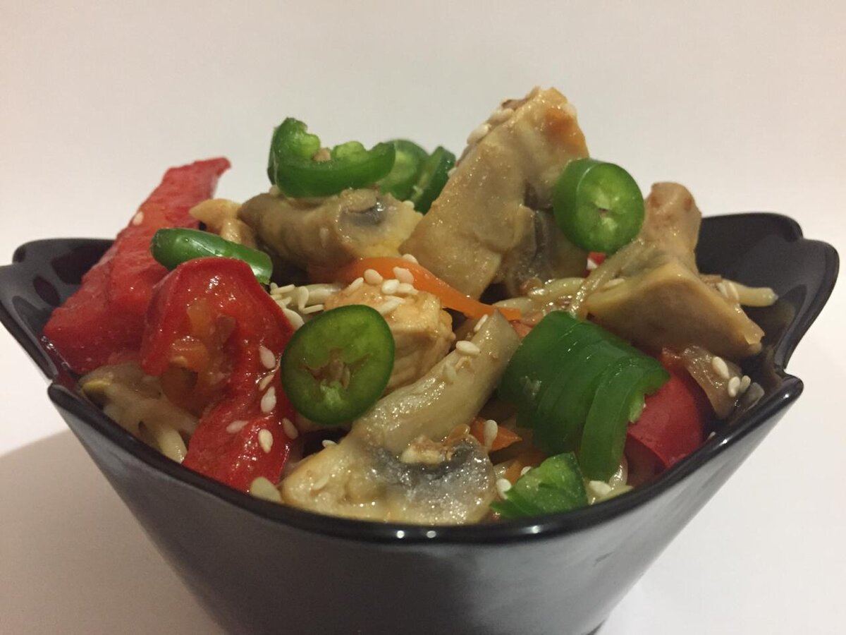Добрый вечер дорогие читатели! Сегодня припозднился, так что готовим быстрый ужин. На приготовление данного блюда у меня ушло 27 минут, уверен и Вы справитесь. И так, приготовим спагетти с куриной грудкой и овощами. Если Вы любите готовить дома, подпишитесь на канал и узнаете еще больше блюд которые можно готовить для своих близких! Для начала раскаляем масло в казане или вог сковороде. И по мере нарезания добавляем наши овощи. В первую очередь я обжариваю чеснок, для того что бы он насытил масло своим ароматом. Затем добавляем лук, его реже довольно таки крупными дольками (мне просто так нравится, режьте как Вы любите) Быстренько шинкуем морковь, можно порезать ломтиками как на плов. Но так как это быстрый ужин, я ее нарезал тонкой соломкой (использовал специальное приспособление). Параллельно нарезке овощей, ставим вариться макароны. Их варим до полуготовности так, как потом добавим их к мясу и овощам, там они дойдут. К овощам добавляем болгарский перец и заливаем соевым соусом (я