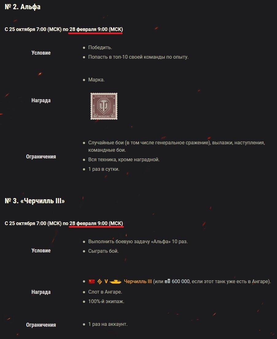 Через 2 дня, 28 февраля 2019 года в 09:00 МСК заканчивается срок для задач акции «Прямой эфир» (Twitch Prime) для 1-го танкового пакета «Альфа». Т.е. после этой даты пакет становится попросту ненужным, а задачи исчезнут. Поэтому, кто ещё не выполнил таковые, добивайте как можно быстрее. Итогово там можно получить хороший премиум танк Черчилль III (или 600.000 серебра, если этот танк уже есть в Ангаре).