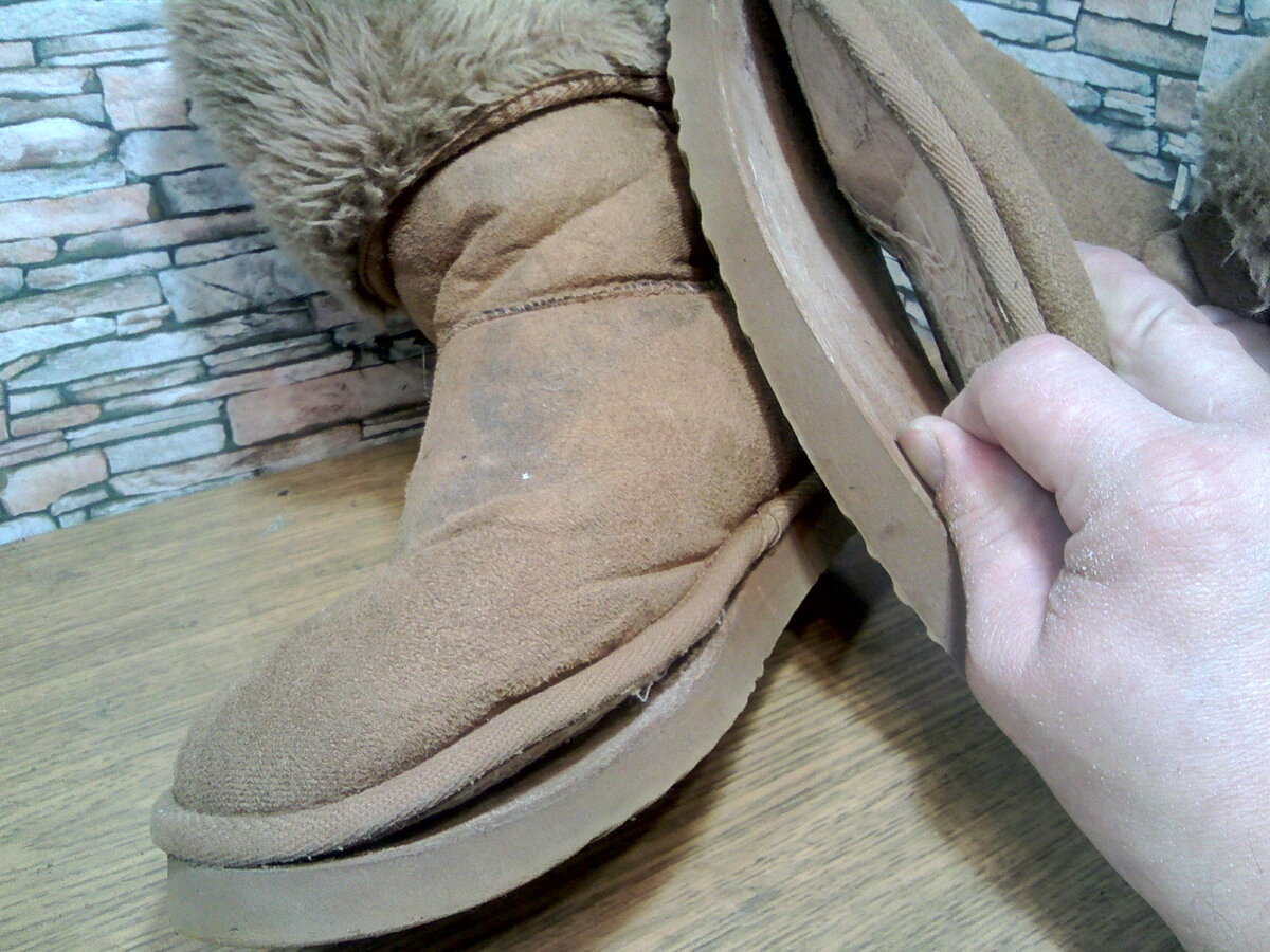 Здравствуйте, дорогие читатели! Принесли недавно нормальные такие настоящие Угги. Но вот что-то не то... Лёгкие, почти воздушные. Уж не знаю, на чём и как они так долго (подошва почти вся сношена) держались. Остатков клея как-то маловато, на моё мнение. Основная стелька, чтобы распределять нагрузку, тоже вроде отсутствует. Поэтому после приклейки мы их прошьём. Так как подошва из мягкого микропористого материала, сбоку прошивать будет не очень красиво - нитка будет глубоко впиваться. Учитывая, что сношенную подошву всё равно нужно будет наращивать, прошьём по следу. Используем самую простую тонкую нить - внешних нагрузок здесь не будет. Затем берём листовую полиуретановую резину. Так как резина всё же "полиуретановая" будем использовать десмакол. Материал промазываем два раза с просушками, а подошва оказалась уж очень пористой - четкой клеевой плёнки нет - на всякий случай промажем её третий раз. Далее термоактивация, приклейка, обработка. Ещё по теме: Профилактика на всю подошву. На