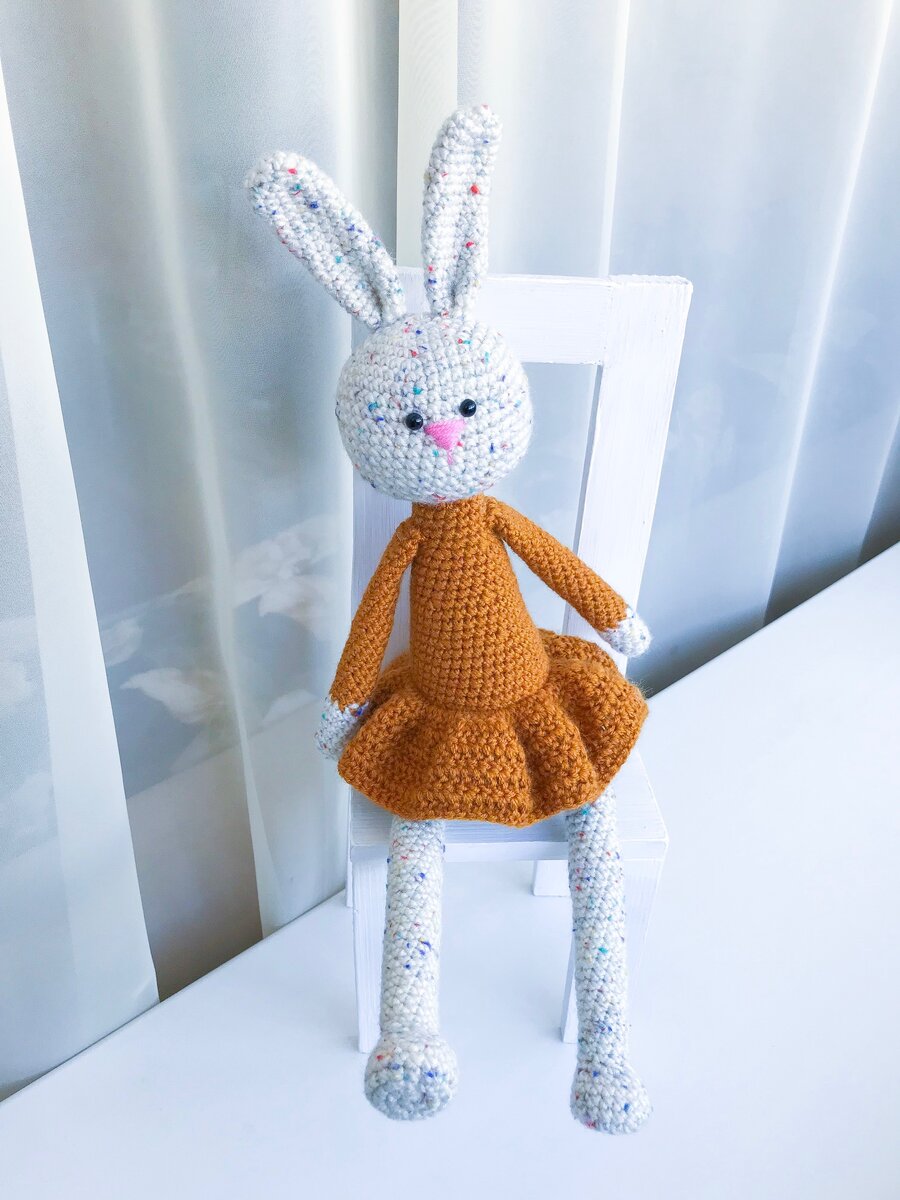 В процессе вязания записывала схему. Потом по ней связала вторую зайку, но, как видите, она получилась немного другой) Вот думаю, либо я где-то ошиблась, либо стала вязать плотнее.