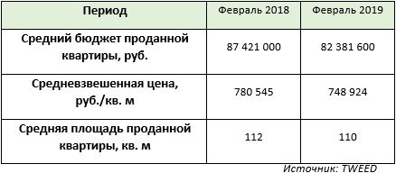 В текущем месяце на первичном рынке высокобюджетной недвижимости Москвы было продано 89 лотов. Для сравнения, в феврале 2018 года было реализовано 75 объектов, т.е. спрос вырос на 15%, сообщает компания Tweed. Некоторые лоты подорожали на 2-4%. Совокупный объем реализованных элитных и премиальных объектов без учета дисконтов составил 7,332 млрд рублей, со скидками – примерно 7,112 млрд рублей. Всего за три зимних месяца совокупный объем реализации дорогих новостроек Москвы составил 20,6 млрд рублей. Этот показатель более чем на 20% превышает результат прошлой зимы. Основные показатели изменились за год так: Наиболее дорогая реализованная в феврале текущего года квартирой без учета дисконта находится в проекте Bunin. Ее площадь составляет 337,2 кв. метра, стоимость - 506,55 млн рублей. Самым бюджетным купленным лотом стал объект площадью 39,78 кв. метров в жилом комплексе I’M. Его цена равна 15,577 млн рублей. Наиболее продаваемыми комплексами в нынешнем месяце стали Neva Towers, Roza R