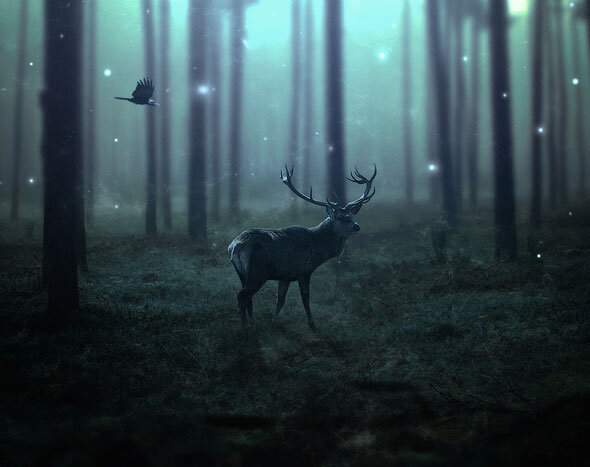 В этом уроке я покажу вам, как создать эмоциональную сцену в тёмном лесу. Главным персонажем у нас будет Олень. Комбинируем различные исходные изображения в единую сцену, для того чтобы у нас получилась волшебная сцена, поработаем с корректирующими слоями, слой-масками, создадим интересное освещение, тени и многое другое.