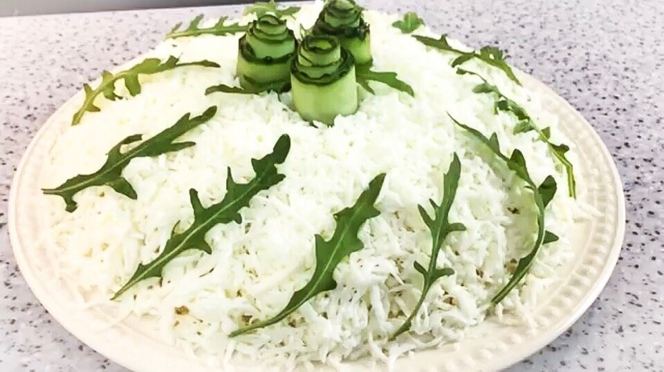 Вкусный салат без майонеза, а с очень интересным и пикантным соусом. Ингредиенты: 1. Твердый сыр - 150 гр. 2. Куриное филе - 1 шт. 3. Авокадо - 1 шт. 4. Куриные яйца - 5 шт. 5. Сыр "Филадельфия" - 200 гр. 6. Репчатый лук - 1 шт. 7. Соль по вкусу. 8. Уксус 9% - 4 ст. ложки. 9. Сахар - 2 ст. ложки. 10. Вода - 1/2 стакана. 11. Соль для маринада - 0,5 ч. ложки. 12. Огурец и руккола для украшения. Способ приготовления: 1. Для начала необходимо замариновать лук. Мариноваться он должен 20-30 минут, за это время можно будет приготовить для салата остальные ингредиенты. Репчатый лук нарезать тоненькими полукольцами. Выложить лук в глубокую миску, залить водой (1/2 стакана) комнатной температуры. Высыпать 3 ст. ложки сахара, 0,5 ч. ложки соли. Добавить 4 ст. ложки 9% уксуса. Все хорошенько перемешать и отставить в сторону. 2. Отварить куриное филе и нарезать на маленькие кусочки. При варки птицы воду необходимо подсолить и добавить специй. 3. Отварить яйца и отделить белок от желтка. Желтки
