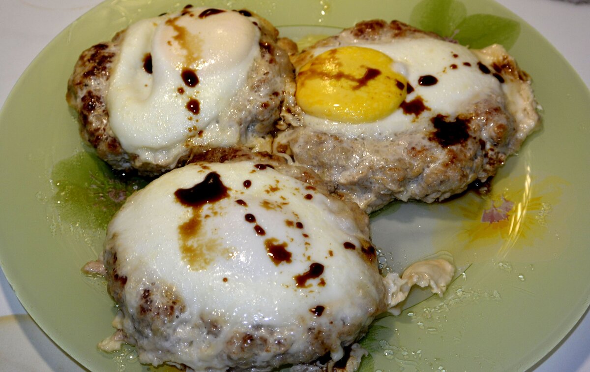 Здравствуйте дорогие друзья! Предлагаю вашему вниманию, незатейливое блюдо, которое по-настоящему очень сытное и вкусное, а приготовить его не составит никакого труда. Список ингредиентов (на три порции): мясной фарш (любой) 300-350 гр; репчатый лук 1 шт; зубчик чеснока; три куриных яйца; подсолнечное масло для жарки 30 гр; соль и перец молотый- по вкусу. Способ приготовления. Фарш соединяем с перекрученным через мясорубку луком и измельченным чесноком. Солим и перчим по вкусу. Далее, лепим плоские котлеты (толщиной около 1 см), выкладываем их в разогретую с маслом сковороду и жарим на сильном огне. Пока наши котлеты жарятся, чайной ложкой, необходимо примять серединку, чтобы получилось углубление. Через две минуты, переворачиваем котлеты на другую сторону и обжариваем, около 3-х минут. Затем, убавляем на среднюю мощность газ, переворачиваем котлеты и разбиваем на их середину, яйцо. Из-за сделанного нами углубления, в самом начале готовки, яйцо с котлеты не скатится. Сверху,