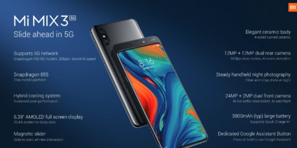 Mobile World Congress 2019 дарит нам множество интересных новинок от всех известных производителей мобильной техники. И компания Xiaomi не является исключением. Первой новинкой, которая была представлена китайским брендом — стал новый Mi MIX 3 5G, оснащенный новым чипсетом и модемом. Собственно говоря в новой версии Mi MIX 3 5G имеется абсолютно всё то, что было и в стандартной версии данной модели. Но теперь в качестве аппаратной основы вместо Snapdragon 845, находится 855 модель с новейшим 5G модемом Qualcomm X50. Технические характеристики Mi MIX 3 5G: Смартфон оснащен Super AMOLED экраном с диагональю 6,39 дюйма и FullHD+ разрешением. Основная камера 12+12 мегапикселей, а фронтальная 24+2 мегапикселя. На борту имеется USB Type-C и дактилоскопический сенсор на задней панели. Аккумулятор ёмкостью 3800 мА\ч с поддержкой быстрой зарядки 10 Ватт. Из дополнений имеется отдельная физическая клавиша вызова голосового помощника Googe Assistant. Оригинальный Mi MIX 3 в комплекте поставки им