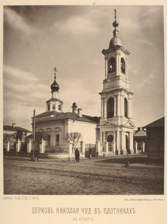 Арбат был улицей торговой и ремесленной. В начале ее, у Арбатских ворот Белого города слободой жили иконники, и теснилось множество лавочек, ближе к концу - плотники, и у самых ворот другой московской крепости. Земляного вала, также было оживленное торговое место. Кроме того, на Арбате жило еще и немалое количество стрельцов. На этой деловой улице было так тесно, что московские власти в 1686 г. были вынуждены издать даже специальный указ: «по обе стороны и мясной, и посной, и пряничной, и горшечной, и сенные шалаши снесть... и впредь на тех местах тем рядам для утеснения той большой улицы и Стрелецкие слободы, которая на той улице, не быть». Государевы плотники соорудили себе церковь и освятили ее во имя св. Николая. Она стала известна по документам с 1625 г., когда церковь была упомянута как уже существующая. В продолжение XVII в. она несколько раз перестраивалась и у неё достраивались приделы. В самом конце XVII в. - 3 мая 1700 г. был выдан антиминс в «новопостроенную» церковь и, сл