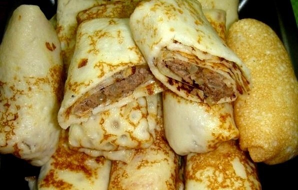 Взбить 4 яйца с сахаром, солью и 400 мл тёплого молока. Добавить муку. Тщательно перемешать, добавить растительное масло и влить остальное молоко. Выпекать на сухой блинной сковородке. Начинка: Говядину отварить со специями (лаврушка и чёрный перец), пропустить через мясорубку, перемешать с обжаренным луком. Завернуть в блинчики и подогреть. Готово!