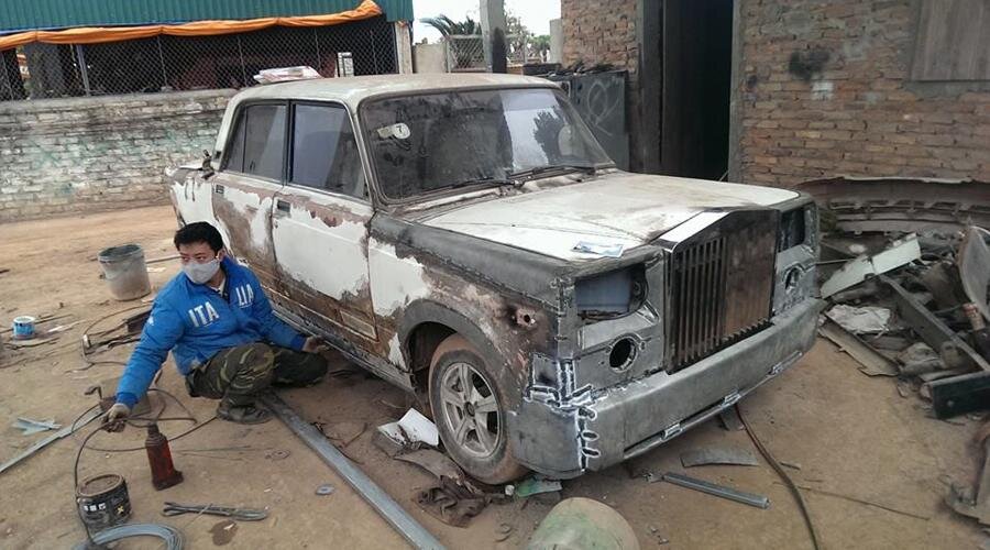 Мечта о крутом автомобиле живет вместе с вами долгие годы от детских фантазий, до взрослых целей. Для многих она является отличным мотиватором в бизнесе, а кто-то идет самым легким путем и просто воплощает ее в жизнь! Одним из таких воплотителей является молодой гаражный инженер из Вьетнама, который очень сильно хотел иметь крутую тачку и желательно как можно скорее. Под рукой в этот момент оказалась лишь старенькая семерка Жигули и огромное желание достичь поставленной цели. То, что получилось вы можете видеть на фото. Судя по всему нашему кулибину для произведения должного эффекта хватило только схожей передней части автомобиля, ведь остальной кузов включая двери и крышу автор трогать не стал. Зато серьезно поработал с радиаторной решеткой, доведя ее до блеска и похожести в форме с оригиналом. Интересен выбор автомобиля, ведь Роллс Ройс Фантом именно в этом кузове пытаются скопировать не первый раз и не только во Вьетнаме! По интернету гуляют знаменитые фотографии самодельного Фа
