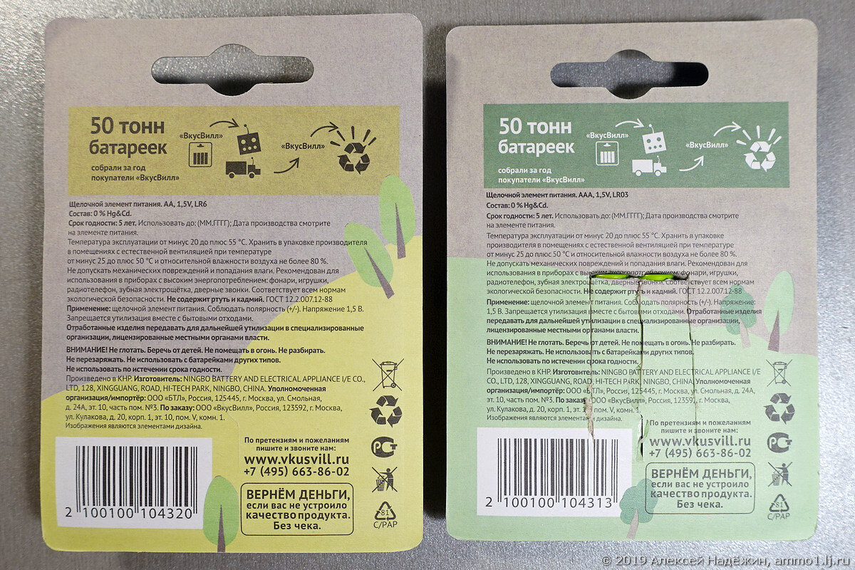 Продолжаю тестировать батарейки. Недавно в магазинах Вкусвилл появились щелочные (alkaline) батарейки AA и AAA под собственным брендом. Они стоят 106 рублей за четыре штуки (26.5 руб за штуку).