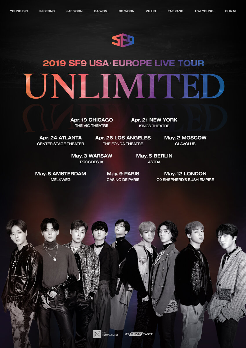 SF9 проведут 2019 SF9 USA·EUROPE LIVE TOUR [UNLIMITED] в 10 городах США и Европы, который начнется 19 апреля (по местному времени) в Чикаго и пройдет по следующим городам: Нью-Йорк, Атланта, Лос-Анджелес, Москва, Варшава, Берлин, Амстердам, Париж и Лондон.