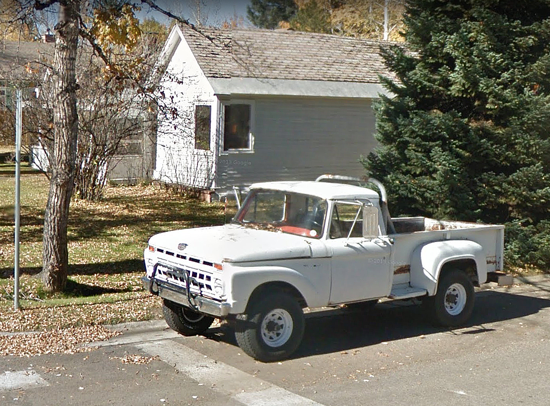 Я уже не раз признавался в любви к американским автомобилям прошлого века. В частности, за их ежегодное обновление внешности. Вот, например, белый пикап с сильным засветом на радиаторной решётке, настолько сильным, что не видно надписи «F O R D» растянувшейся между поворотниками. Они, кстати, помогают определить нижнюю возрастную границу. До 1965 года указатели поворота размещались рядом с фарами, непосредственно в решётке радиатора, которая в свою очередь очерчивает верхнюю границу. Два ряда ячеек украшали морду только в 1965 году. Кузов с выступающими арками называется Flareside и своей длиной говорит о грузоподъёмности 3/4 тонны. Большой клиренс выдаёт повышенную проходимость. Итак, мы можем смело заявить что перед нами Ford F-250 4×4 Flareside 1965-го года выпуска. Любопытные факты. F-серия является самым продаваемым пикапом в Соединенных Штатах с 1977 года и самым продаваемым автомобилем с 1986 года; это также самый продаваемый автомобиль в Канаде. А начиная с 2018 модельного го