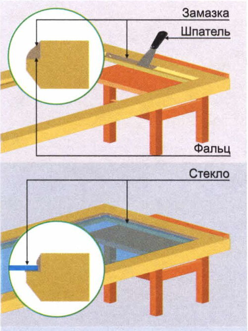 Грамотно нанесенная при остеклении окон замазка надолго обеспечит отличную тепло- и звукоизоляцию, а также ударопрочность стекол за счет того, что она плотно вокруг них облегает. Инструменты для работы: шпатель, молоток. Установка стекла на замазку Нарезаем стекла на 3-5 мм меньше ширины и длины площади остекления. С помощью шпателя заполняем периметр фальцев замазкой. Укладываем в раму стекло и притапливаем его, слегка прижимая по углам и сторонам, но не посередине. Втыкаем в замазку гвозди на расстоянии 20 см друг от друга и забиваем их молотком, ведя бойком по стеклу. Затем, скатав замазку «колбаской», укладываем ее большим пальцем поверх стекла, полностью заполняя угол фальца. Распределенную замазку растягиваем шпателем по периметру. Излишки аккуратно соскребаем. Затем переворачиваем створку на другую сторону и убираем выдавленную из-под стекла замазку. Возвращаем створку на место.