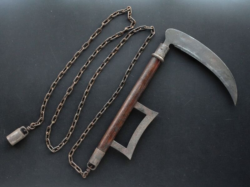 Кусаригама Японское оружие. На вид эка диковина токая,палка, серпа образное лезвие,цепь и груз.Первое что приходит в голову ну и как с этим обращаться. Изначально кусаригама был сельскохозяйственным инструментом,а имена серпом.К серпу добавили цепь с грузом и стали применять в бою. Размеры кусаригама приблизительна были длина лезвия составляла 20 см длина рукоятки 60-90 см ну а цепь примерно от 1,5 до 2,5 метров.Груза использовали различные, гиря образные ,острые,шипастые . Кусаригами использовали как на ближнем расстоянии так и на дальнем для атаки и обороны,что делала это оружие весьма эффективным.Техника владения заключалась в следующем,цепью запутывали врага или выхватывали у него оружие,грузом оглушали ,наносили, увечия(ранения) лезвием добивали врага или отбивали его атаки. Кусаригама пользовалась большим спросам у ниндзя это Японский наемный убийца. Период использования XIV-XVII века .