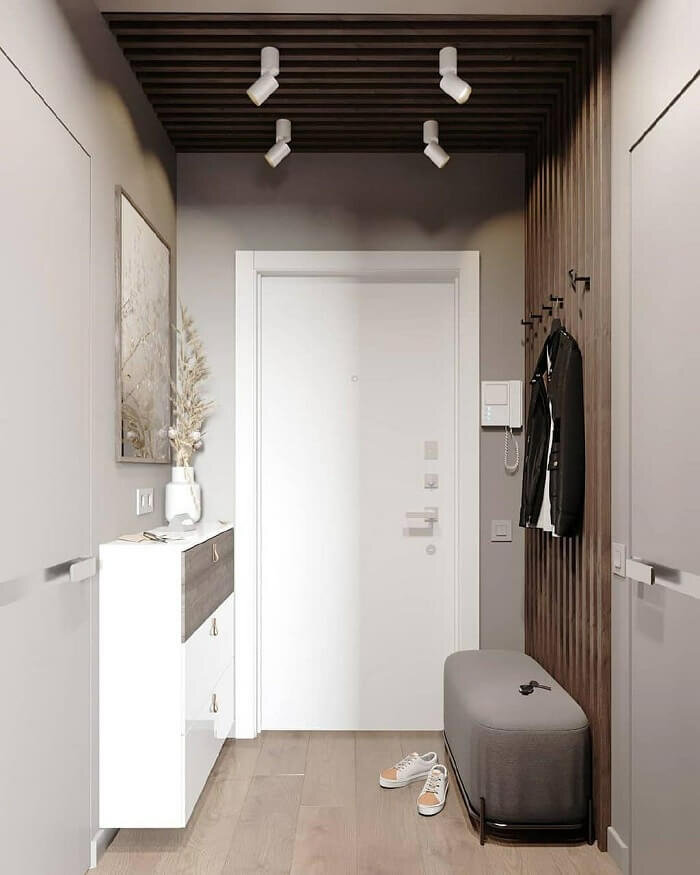 Либо отгородить имеющуюся в коридоре нишу с помощью стены из гипсокартона. Или же просто выделить часть коридора под гардеробную.